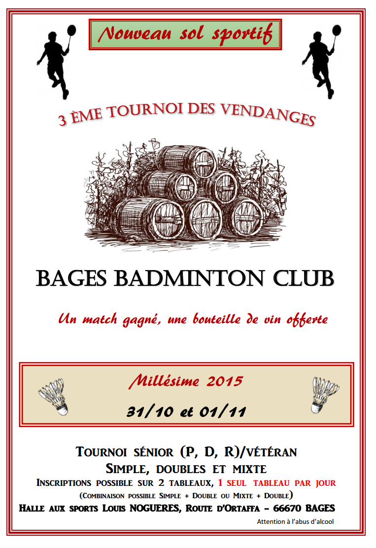 Organisé par les bénévoles du Bages Badminton Club, le 3ème Tournoi International des Vendanges de Bages s’est déroulé les 31 octobre et 1 novembre 2015 à la Halle Aux Sports, espace Louis Noguères.