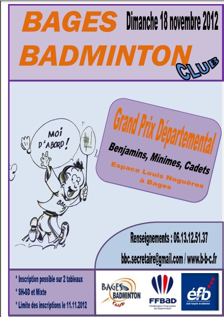 Le Bages Badminton Club est heureux de vous inviter au 2ème Grand Prix Départemental Benjamin, Minime et Cadet de la saison 2012-2013 qui se déroulera le dimanche 18 novembre 2012 à la Halle aux sports de Bages.